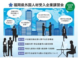 福岡県行政書士会は、福岡県より正式に「外国人材受入企業支援事業」の委託を受け、定期的な講習会、業種別セミナー等を行っています。